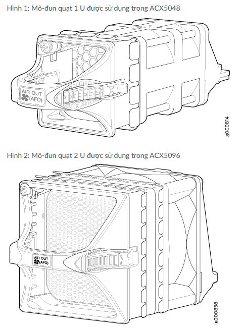 Các mô-đun quạt trong bộ định tuyến ACX5000 là các đơn vị thay thế trường (FRU) có thể chèn nóng và tháo rời được. Các mô-đun quạt này được thiết kế để không khí đi vào từ các cổng đến FRU – Airflow Out. Các mô-đun quạt được lắp đặt trong các khe cắm mô-đun quạt trên bảng quản lý của bộ định tuyến bên cạnh nguồn điện.
